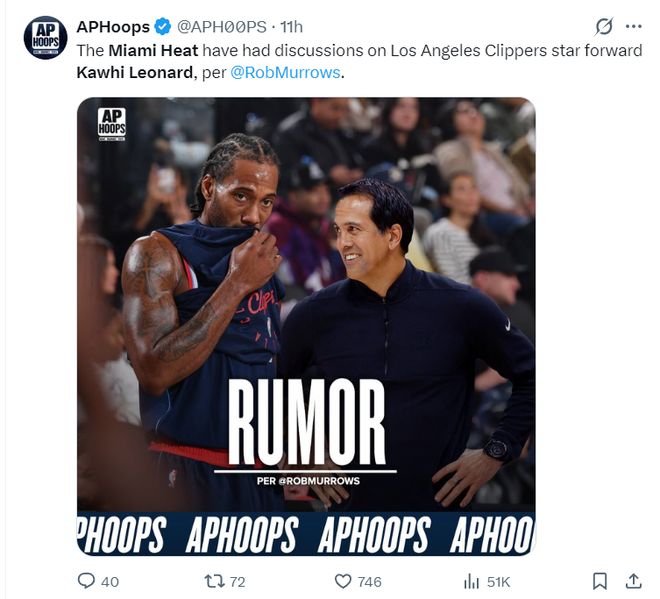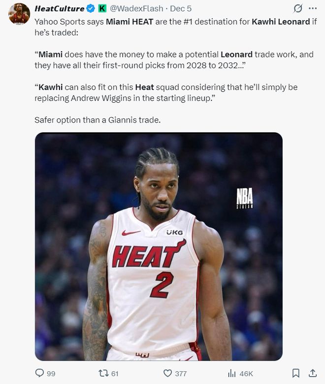 实际上在12月5日,《雅虎体育》就分析过,如果科怀-莱昂纳德要被交易,那么热火队会是他的首选地,迈阿密有足够的薪金空间来促成交易,并且他们有2028-2032年的首轮选秀权,小卡来到这里也只需要顶替威金斯的位置,他可以轻松完成这项工作,热火交易得到小卡比交易得到扬尼斯要稳妥的多。