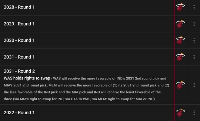 大家可能发现了,这两笔交易模拟都出了2030年首轮签,肯定是无法同时送2030年首轮签的,可实际上热火有2028/2029/2030/2031/2032五个首轮签,所以热火可以从2029年、2031年两个首轮签,因为两个模拟中都只出了一个首轮签,所以理论上是可以同时交易得到莫兰特+莱昂纳德的。